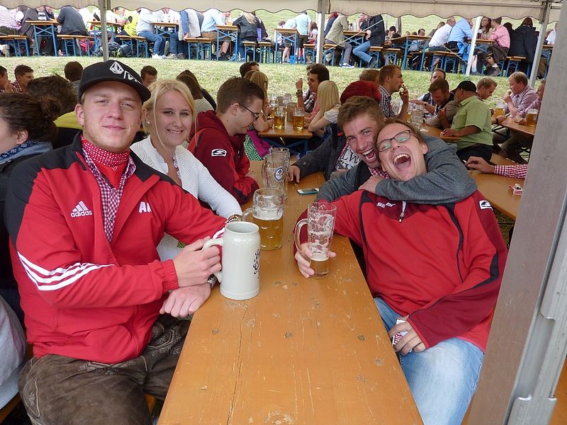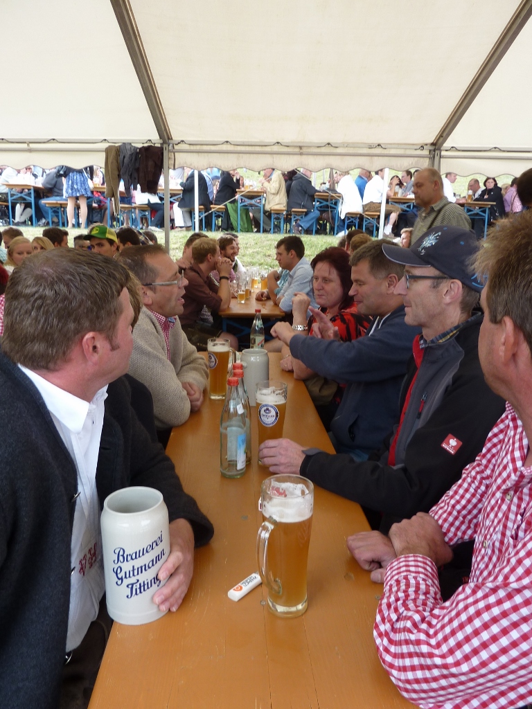 Auf dem Gutmanngelände fanden wir oben auf der Anhöhe einen schönen überdachten Platz. Von hier aus hatten wir einen herrlichen Überblick auf das Fest. Am späten Nachmittag traf endlich unsere Nachhut (8 Personen) ein. Sie standen im Stau. Dementsprechend war ihr Durst. Die erste Maß war ruck zuck leer. Ein SSV-ler hat gemeint, „die habe ich jetzt für den Durst gebraucht“. Von da an gab es nur noch das leckere Gutmannweizen. Die SSV-Abordnung gab ihr Bestes und hatte ihren Spaß. Später gab es ein kleines Duell im „Kerwaliedli singa“ mit den Jungs am Nebentisch. Was der Beweis für die gute Stimmung war.